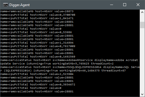 When just running the application manually, e.g. by pressing (F5) in Visual Studio, it will use the ConsoleProcessor. Otherwise the InfluxDbProcessor will be used. You can tweak this in Digger.Agent.Bootstrap.ProcessorsModule.