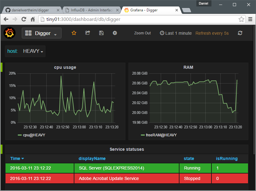 Digger is designed to run as a Windows service (using TopShelf). The idea is that it has configurable Collectors that collects time series data that then, via a Dispatcher, is forwarded to a Processor that e.g. stores the data in InfluxDB. From this, you can then create dashboards in Grafana.