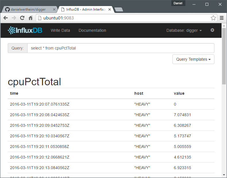 Now, create a database in InfluxDB. Name it according to configuration "digger". Ensure the host is correct. Then just hit F5 and have a look in InfluxDB.