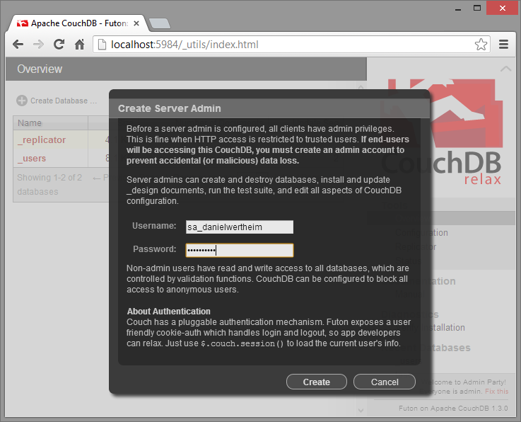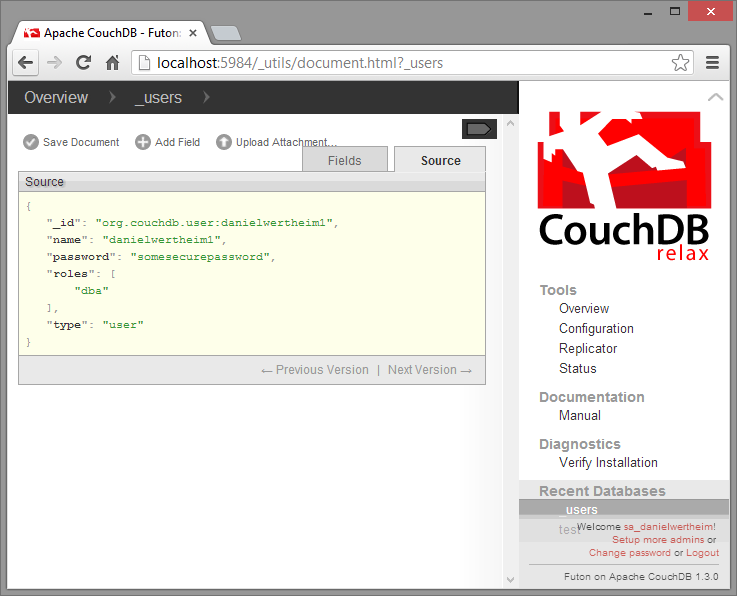 Voila! It’s now secured. But again, you really should look into the link above regarding SSL, since CouchDb uses HTTP as transport protocol, hence credentials will be transmitted unsecured.