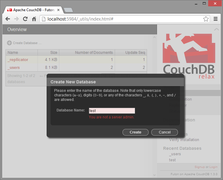 Now, log out and then try to create a database:
