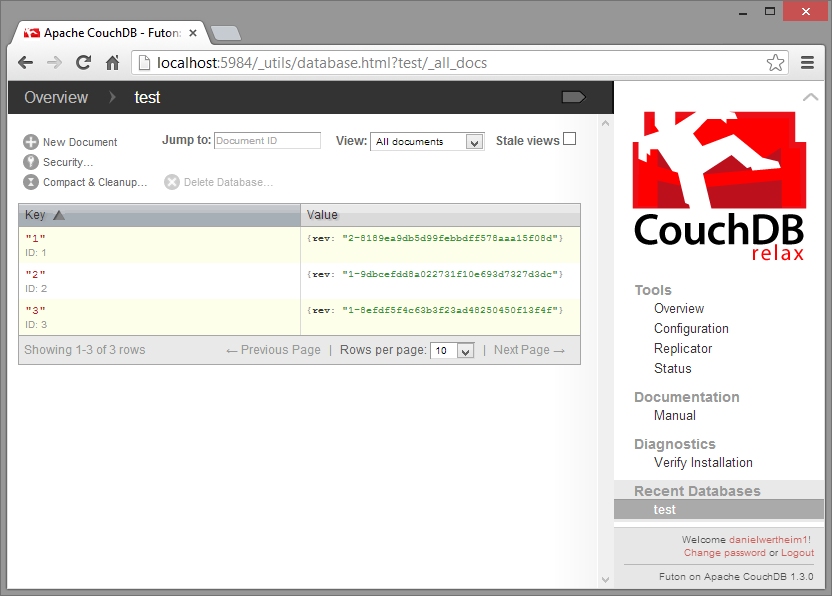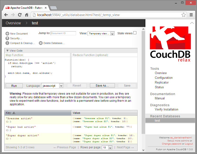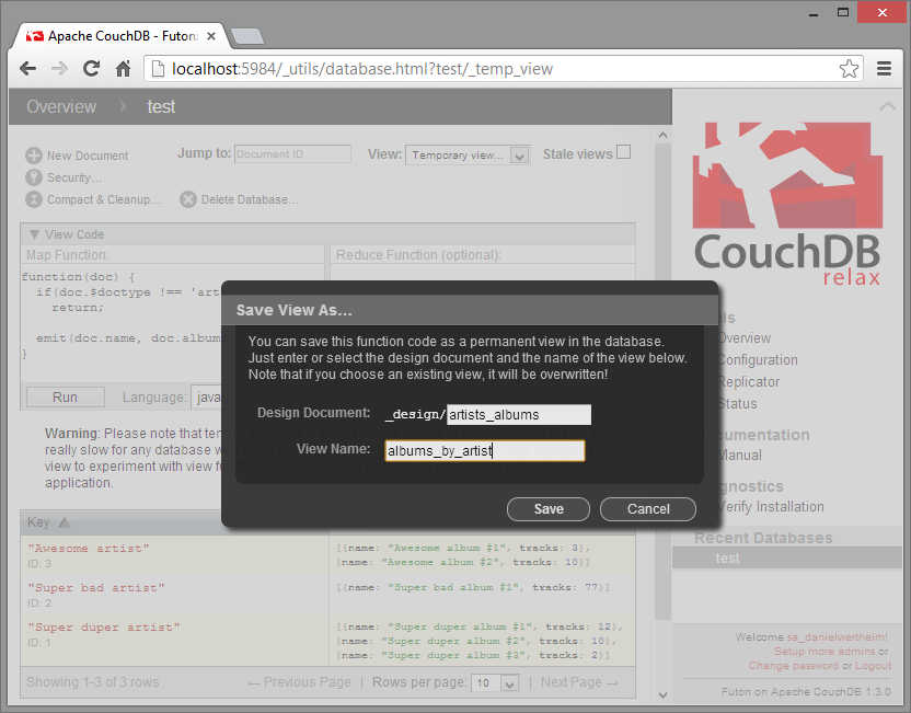 While you were fetching a coffee or reading some Twitter feeds our Facebooking, I took the liberty to add two more artists with some more albums so the database now contains a total of three artists. Now, lets look at them using a view. Before we create our own view, lets use a built in system view called all_docs. Execute a GET against the following address: http://localhost:5984/test/_all_docs. The response will be something like this: