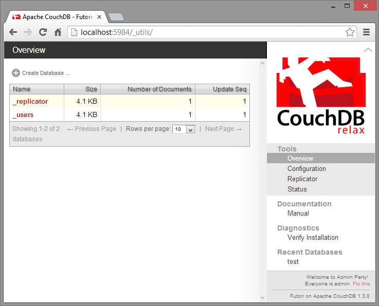 http://localhost:5984. You will be presented with something similar to this: