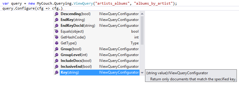 var query = new MyCouch.Querying.ViewQuery("artists_albums", "albums_by_artist");