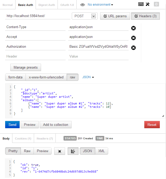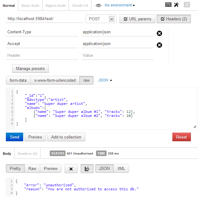 Time to try it out. Execute a POST against http://localhost:5984/test/ where test addresses the database we created before.