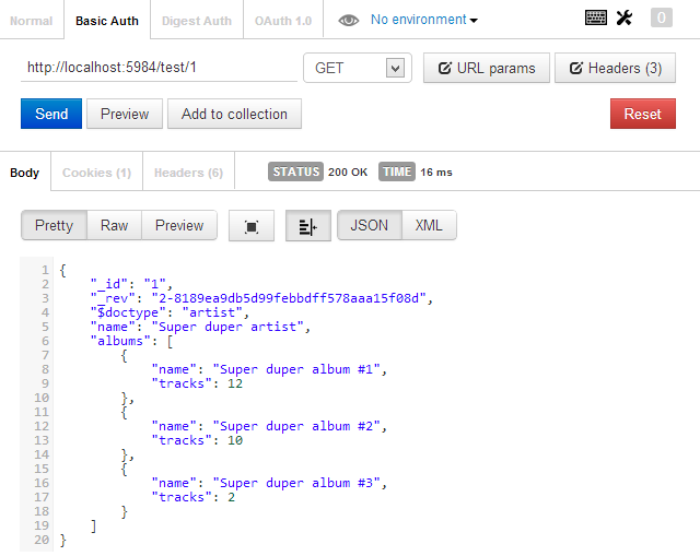Notice the response. We secured the database hence we need to provide credentials for an user that is a member. I will use basic authentication for this.