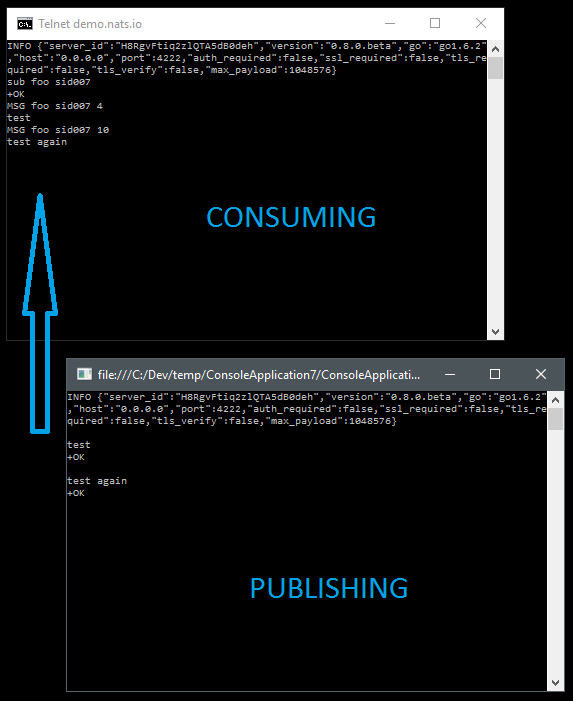 Without any deep thoughts (so you can most certainly laugh at my hacky bits), using C#, I just put down something simple that publishes messages to a subscriber in Telnet: