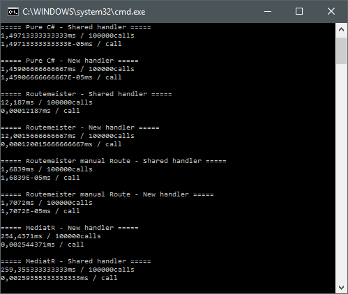 Time("MediatR - New handler", numOfCalls, mediatorSharedHandler.PublishAsync);