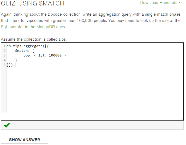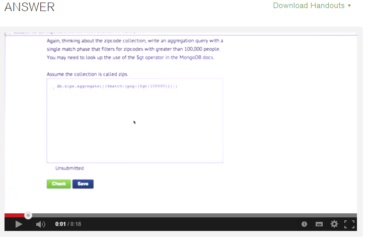 Each week there are some assignments. Some you can complete in the browser. Some you need to use the console to import and query some data in MongoDB, so that you can answer a question in the browser. To some assignments you just need to add a few lines to an existing ASP.Net MVC application and then run a verification application against it. The feedback is instantaneous. You have three attempts for each assignment.