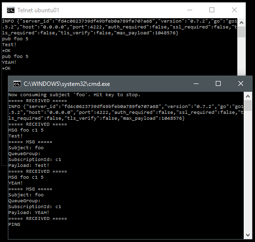 With this in place, you can just start publishing messages to the subject foo and you should see it being shown in the consumer console. Silently answering to PING messages.